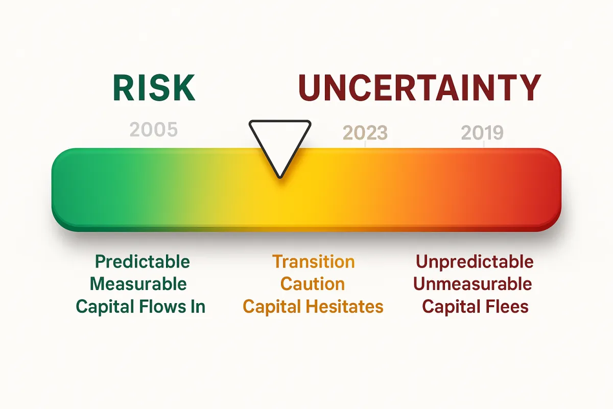 "Capital flows toward stability and evaporates in the heat of uncertainty. At the green end of our spectrum, capital pours in—reinsurers compete, premiums stay stable, coverage remains available. Push into the red zone of uncertainty, and capital evaporates altogether. Insurers withdraw, state-run entities swell with risk they cannot manage, and consumers face higher costs or no coverage at all."